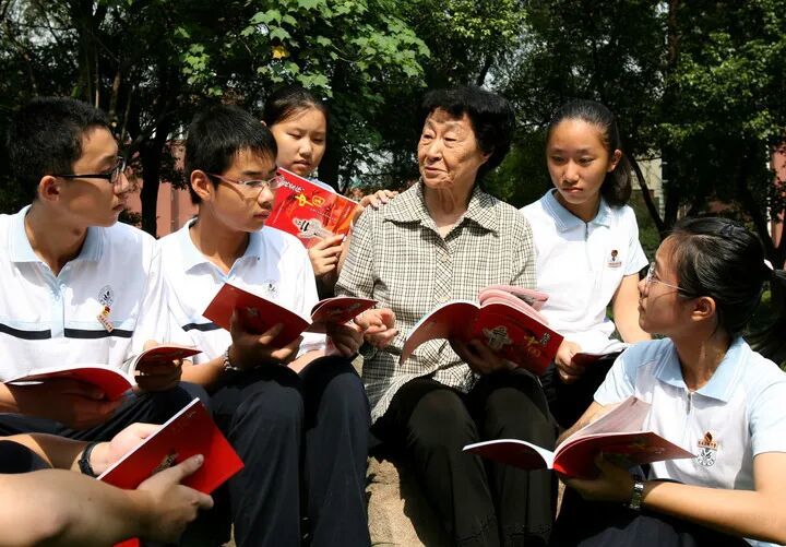 2009年9月4日,于漪(右三)指导学生们精读自己主持编写的爱国文学精品读本《我爱你,中国》。新华社记者 刘颖 摄