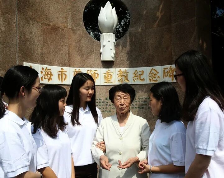 在“上海市尊师重教纪念碑”前,于漪(右三)同上海市教师代表进行交流(2015年9月9日摄)。 新华社记者 刘颖 摄