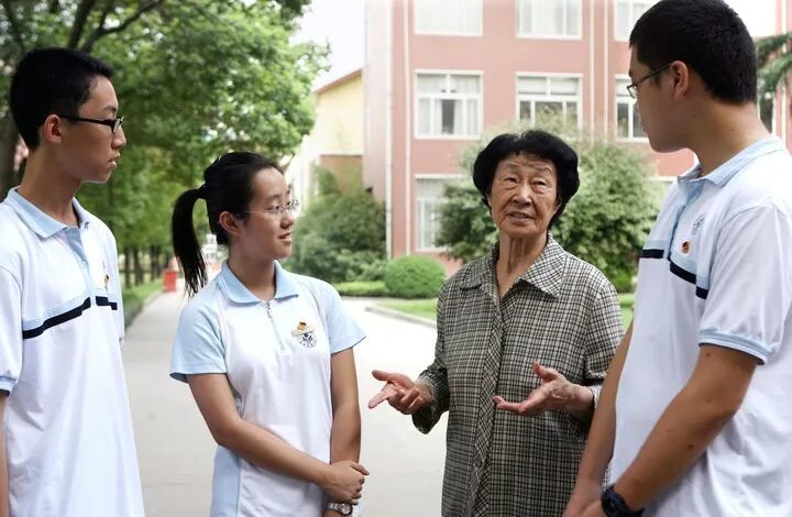 2009年9月4日,于漪(右二)在上海市杨浦高级中学与学生们交流。 新华社记者 刘颖 摄
